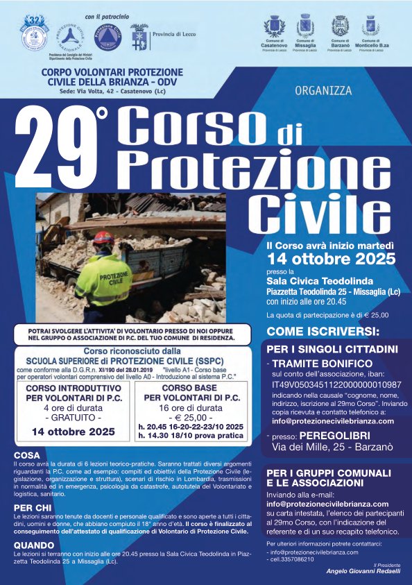 via A. Volta N°42 23880 Casatenovo (Lecco) E-mail info@protezionecivilebrianza.com cell. 335/7086210 Iscritta nell’elenco delle Organizzazioni di Volontariato del Dipartimento della P.C. il 08/01/1998